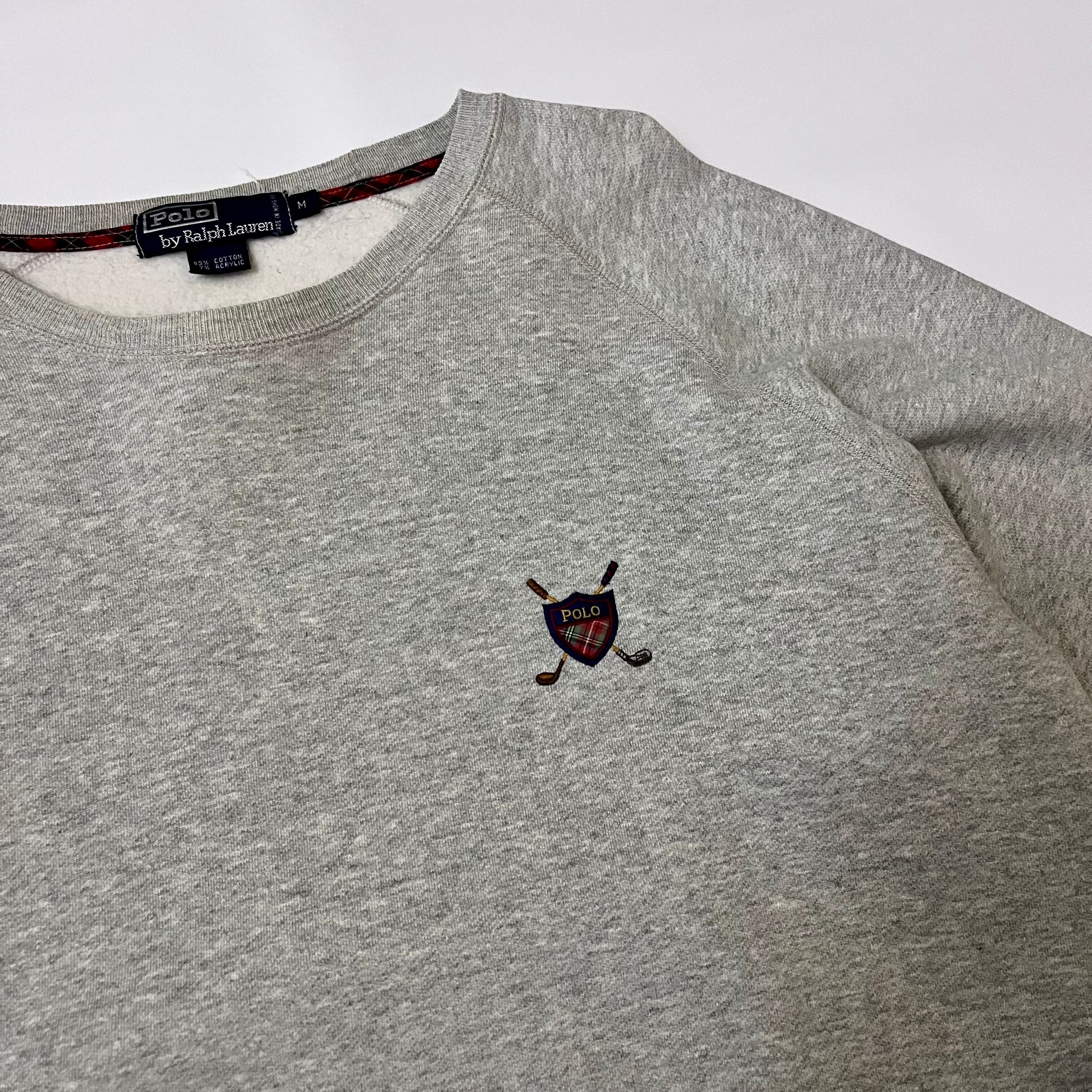 胸にはクラシックなゴルフクラブとシールドエンブレムのワンポイント刺繍