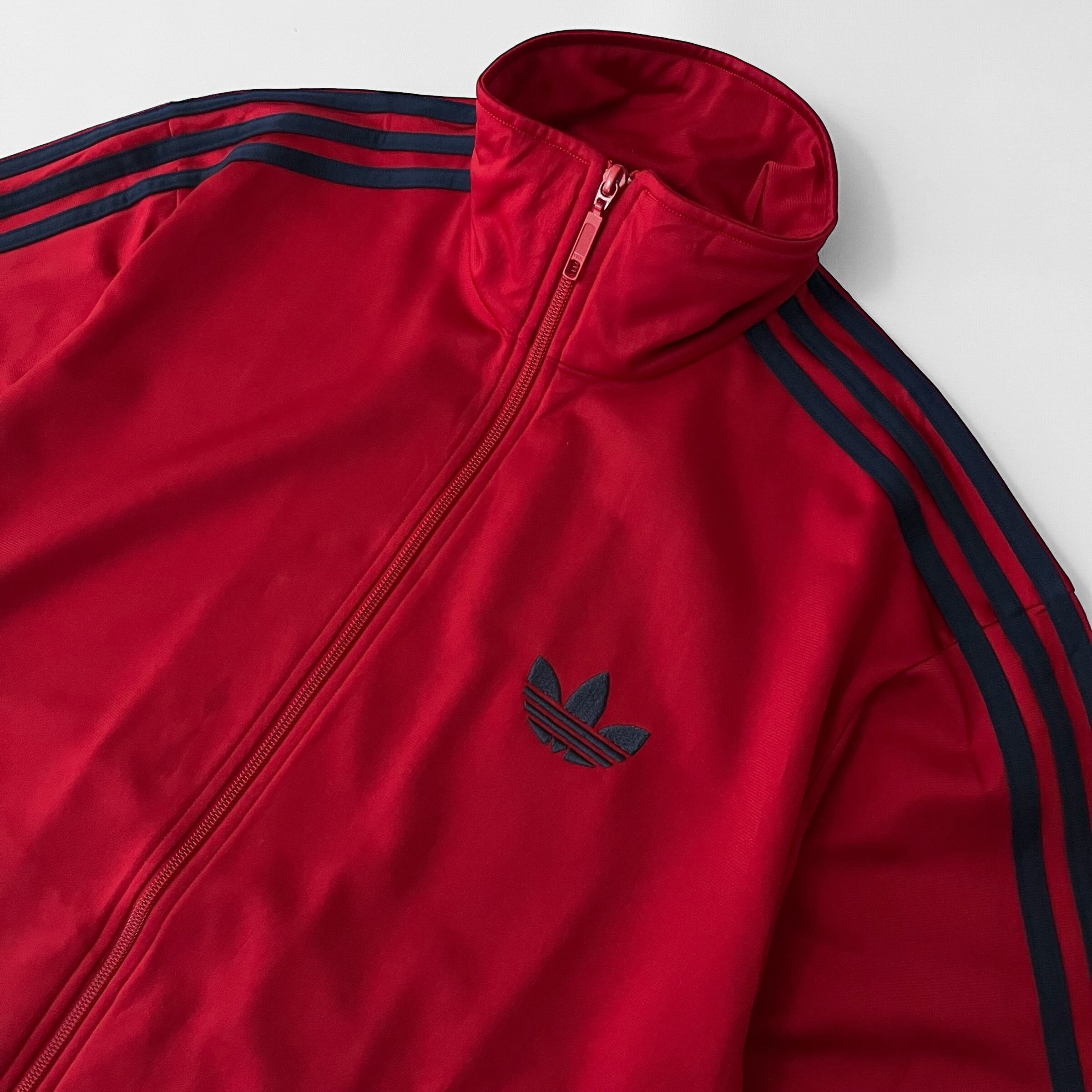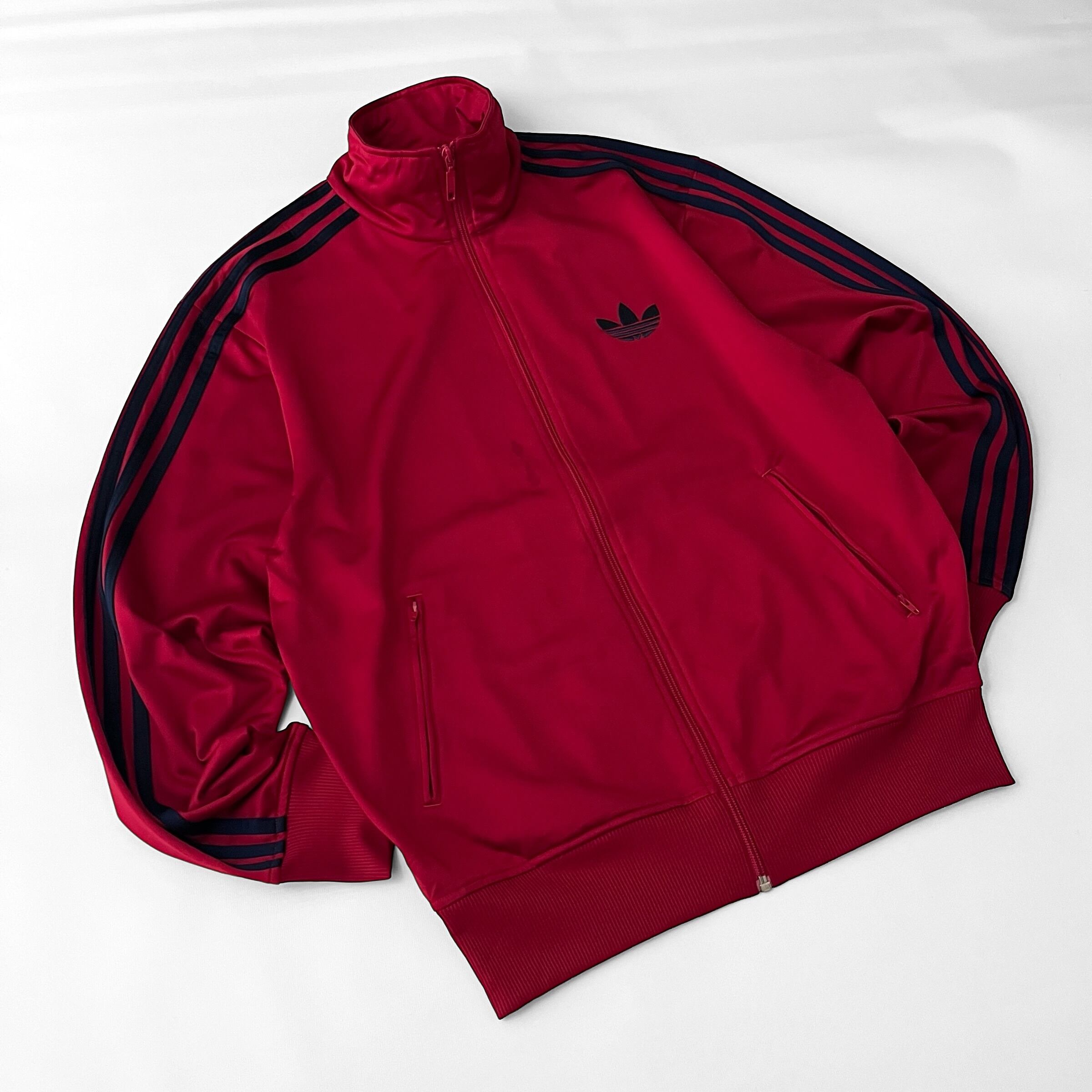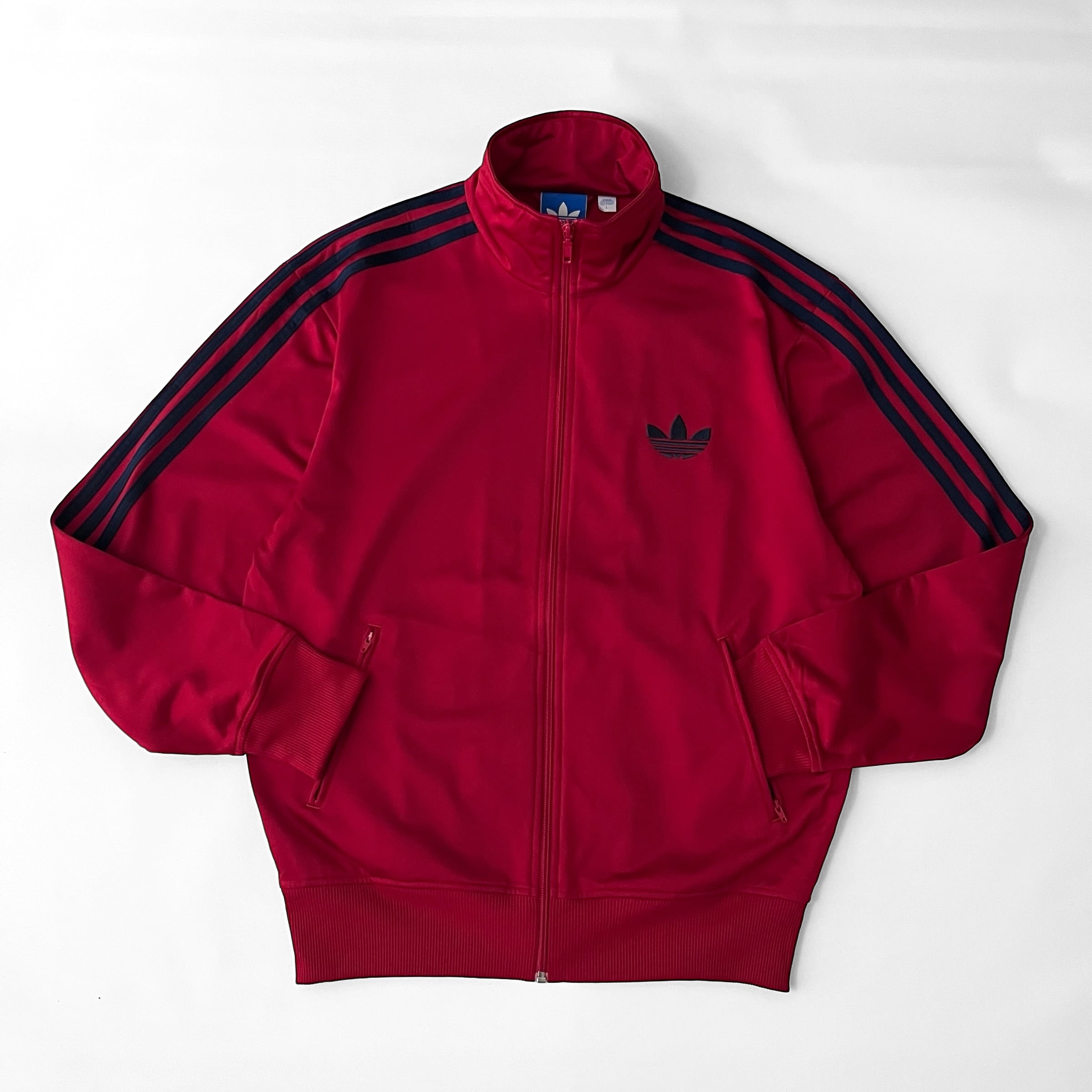 袖の定番ネイビー三本ラインに、胸には同色トレフォイルマークのワンポイント刺繍
