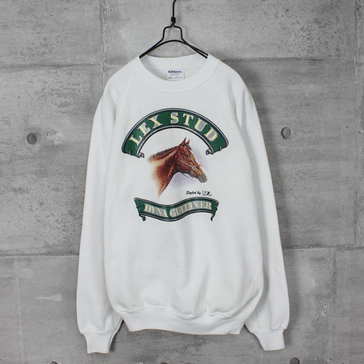 希少価値の高くなっている、80年代ヘインズのアメリカ製ボディを使った、プリントトレーナーになります。人気の動物系プリントで、デザインは日本ダービー馬であるダイナガリバーになります。スポーティーで動きやすいラグランスリーブで、メンズがジャストで着てもいい商品です。