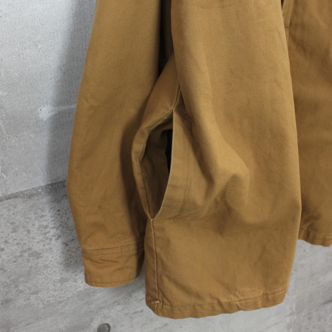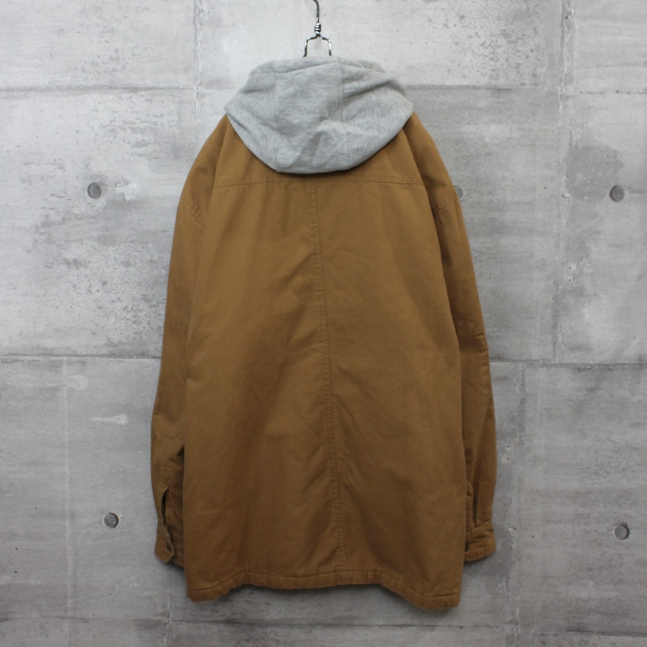 ワークジャケットの中でも人気の高いカラーになる、ダックブラウンのジャケットになります。スウェットパーカー部分はフェイクレイヤードでセットインになり、前立てボタンとジップアップで防風性も高いです。メタルのスナップボタンにはすべてブランド刻印入り、サイドにはハンドポケットが付き、胸の大きめフラップポケットがワークウェアらしいポイントになります。