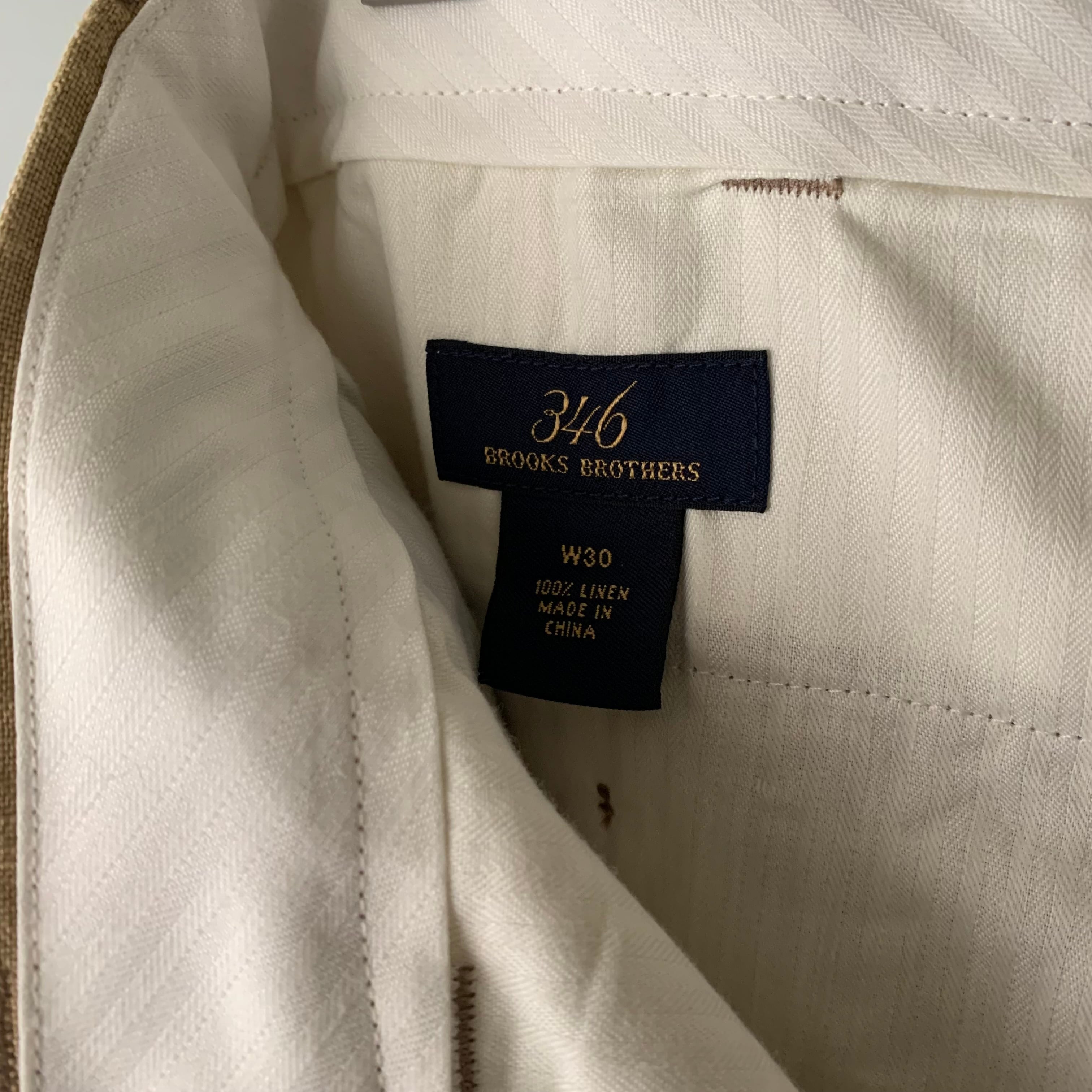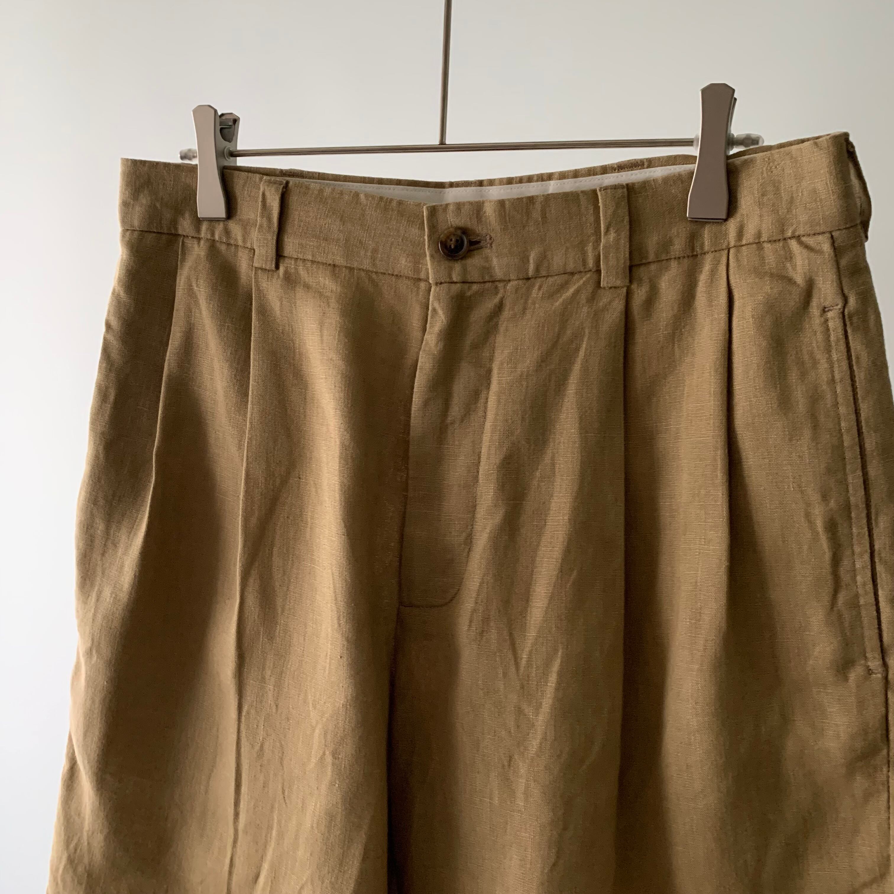 涼しい麻100%生地にクラッシックなツータックの濃いめベージュカラー