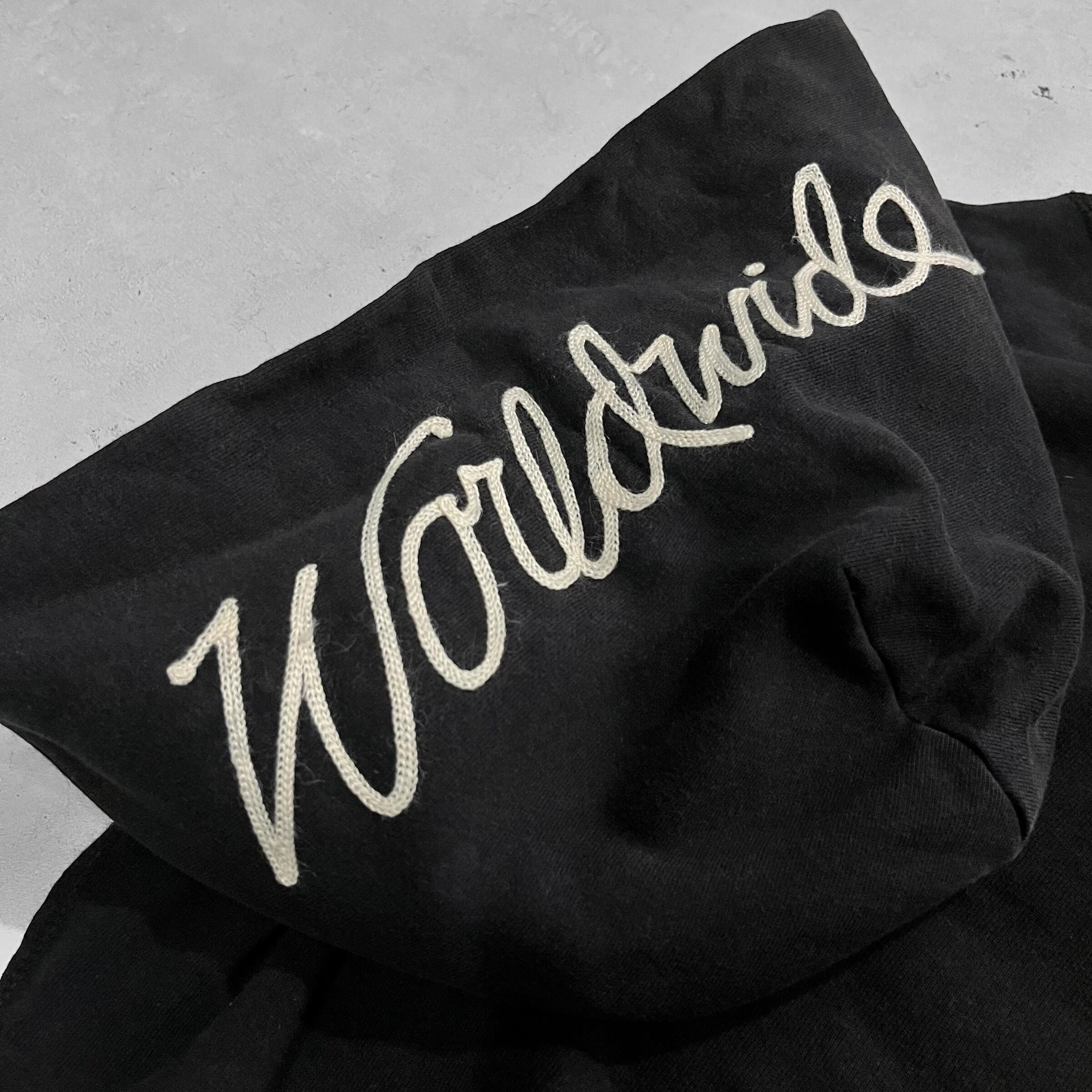 胸にはブラックボディに映えるレッドのワンポイント刺繍入りで、フーディにはワールドワイドのサガラ刺繍